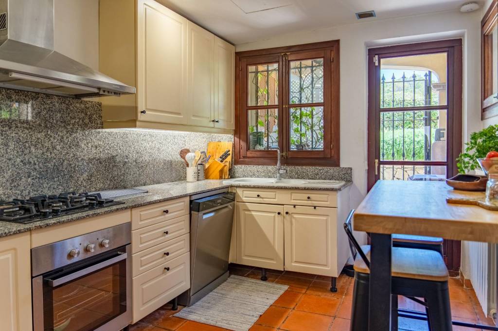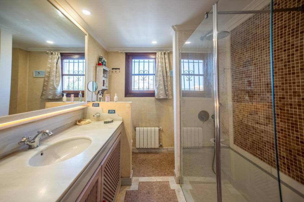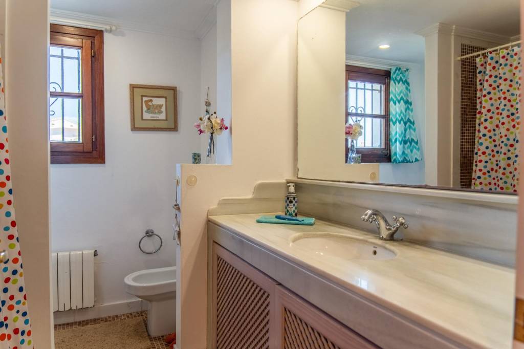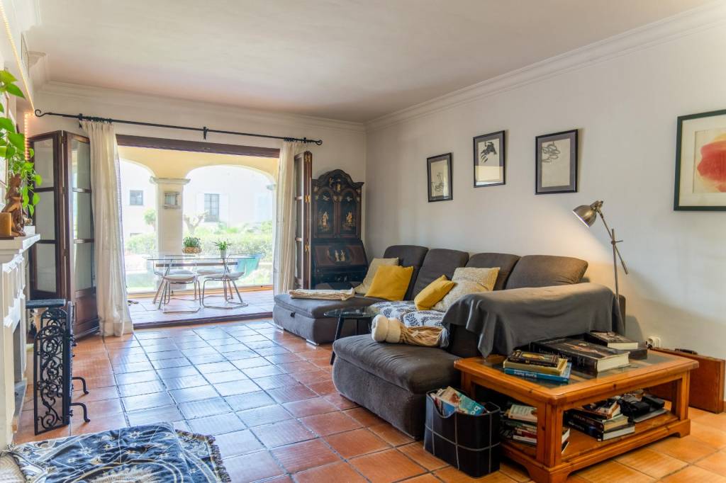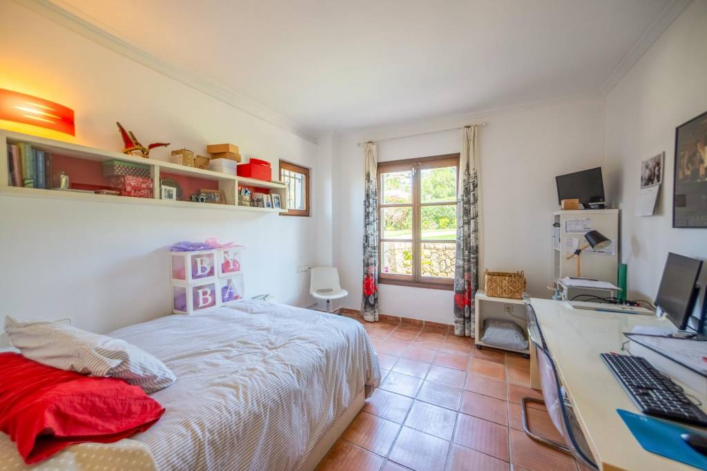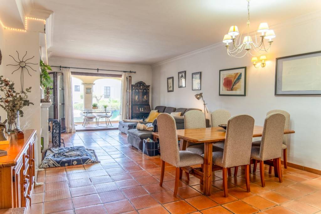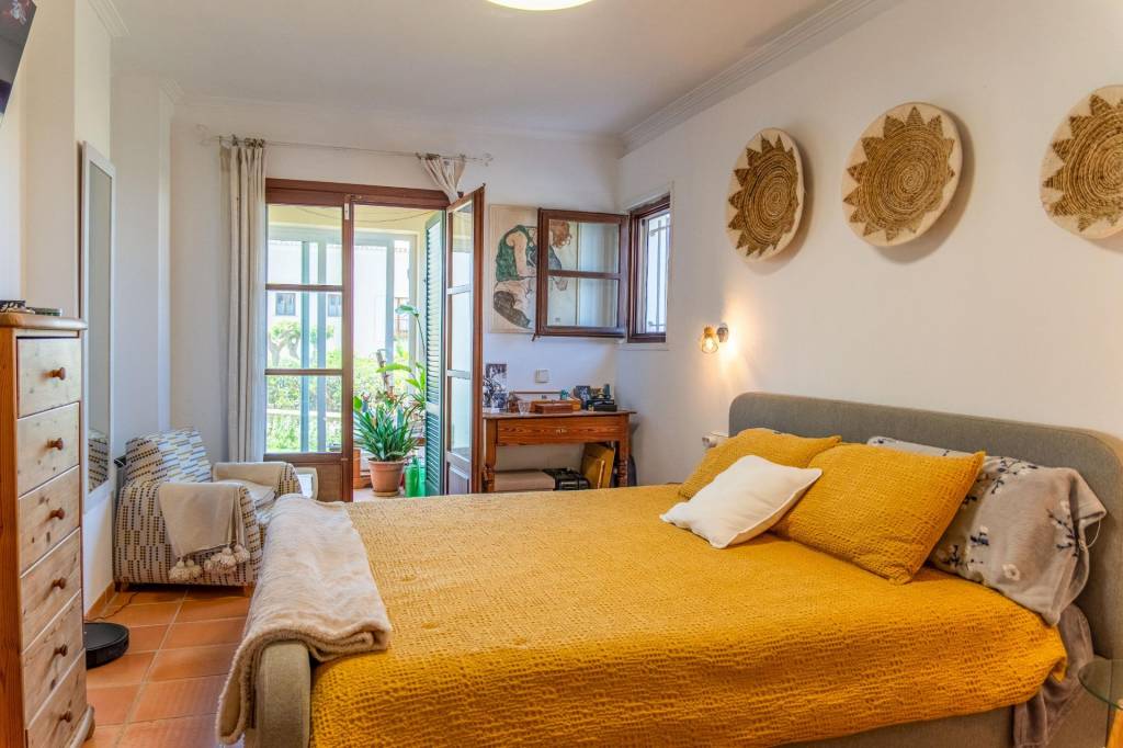 En el interior, el salón-comedor con chimenea ofrece acceso directo al jardín. La cocina, independiente y completamente equipada, incluye encimeras de granito y coladuría. Dispone de dos dormitorios dobles, ambos con baño en suite, vestidor y armarios empotrados, además de un aseo de cortesía. La vivienda está equipada con aire acondicionado integrado, ventanas de madera con doble acristalamiento, suelos de cerámica y persianas mallorquinas. Tiene plaza de garaje, trastero y sistema de seguridad.