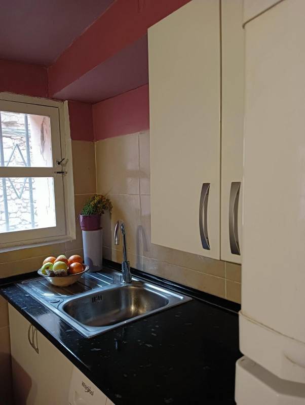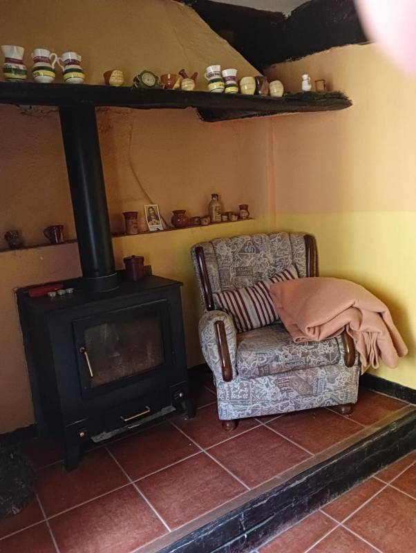 Cocina equipada con cocina económica de leña en perfecto estado.