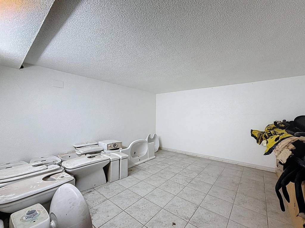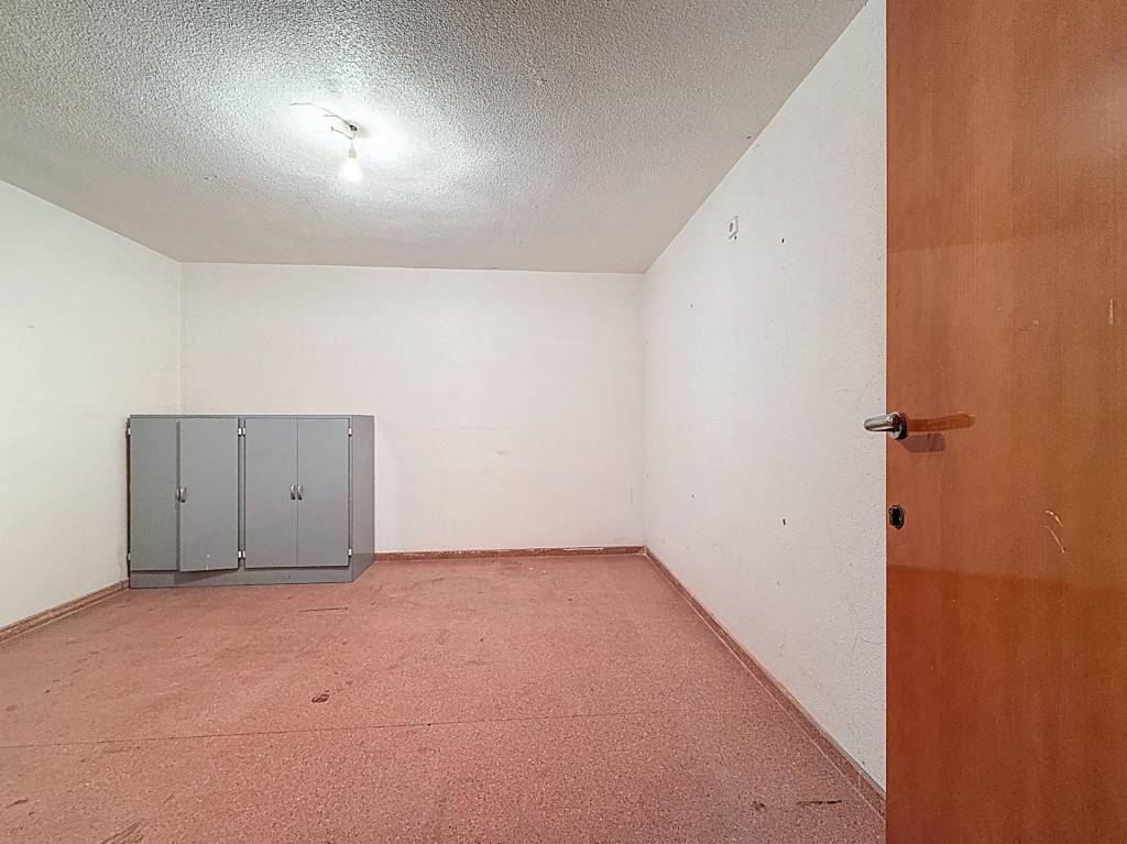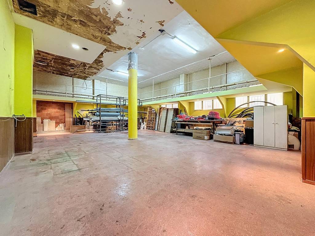 4 ml que conecta con la calle y aporta visibilidad (o luz natural si piensas en un futuro salón). Junto a ella, el despacho y los dos aseos marcan una primera franja de uso de unos 65 m². Desde ahí se pasa al gran almacén, diáfano, con altillos perimetrales que multiplican la capacidad de guarda y que invitan a imaginar distribuciones versátiles en un eventual cambio de uso (dormitorios con armario, zona de estudio o un trastero para cada vivienda).